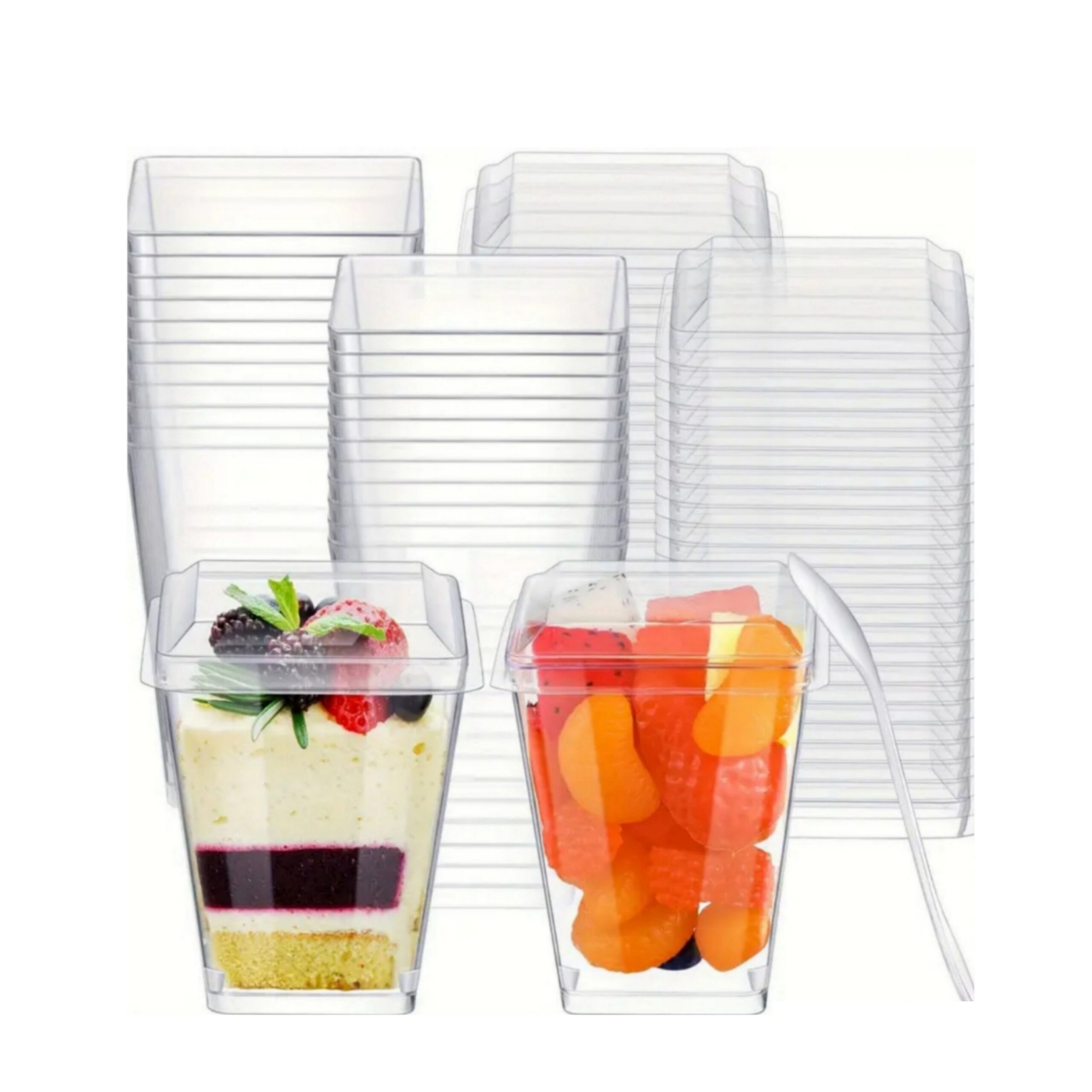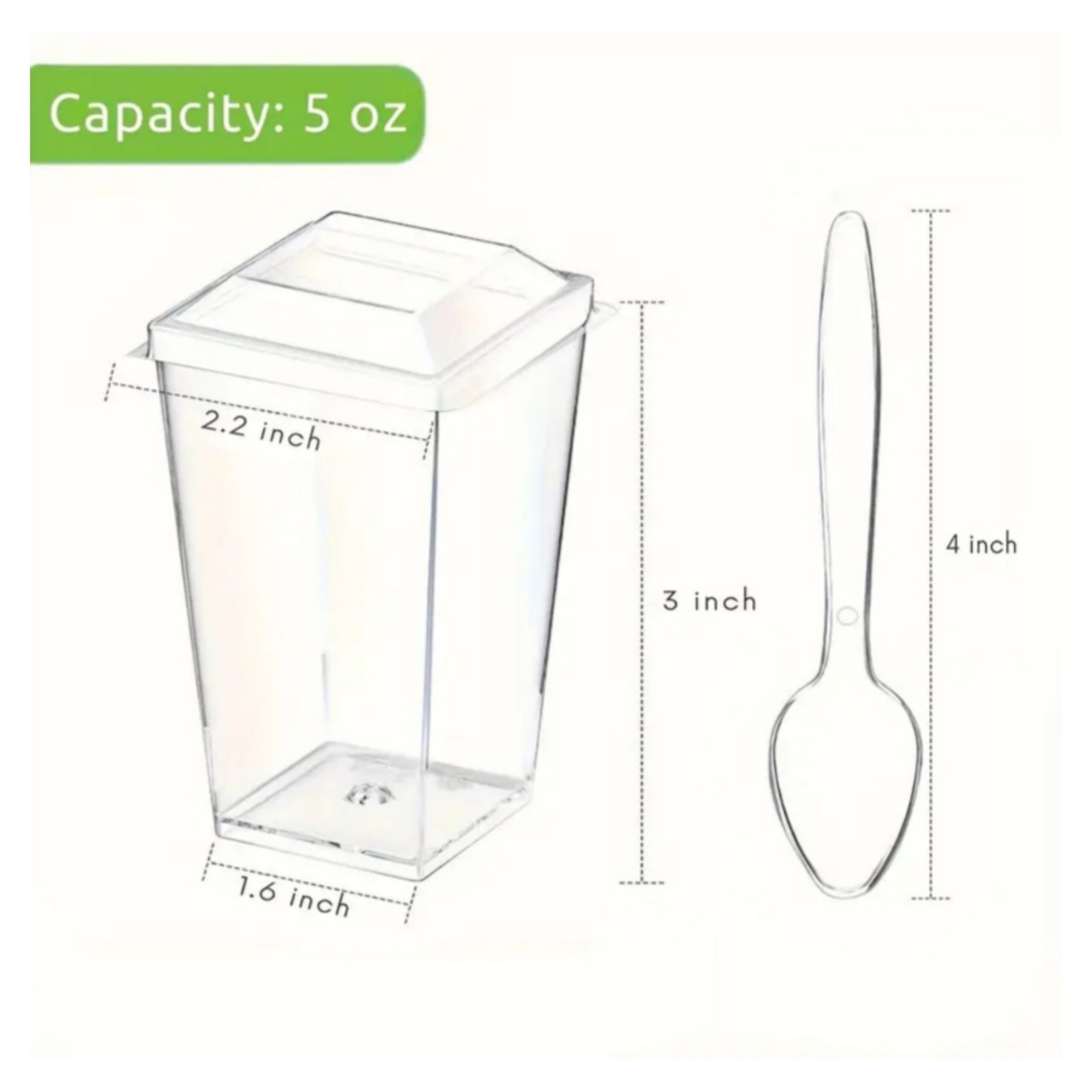 Great for serving beverages, appetizers, and desserts. Clear construction allows for easy product identification. This product is durable & disposable with an attractive appearance. Comes with spoons and lids.